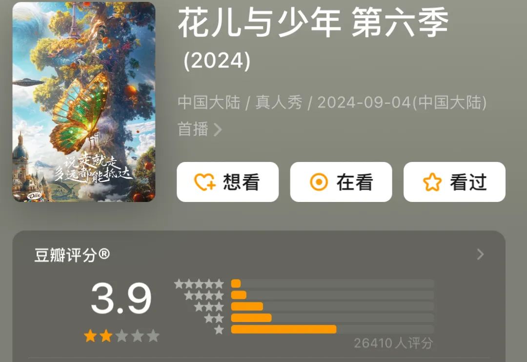 与此同时,虽然《花少6》因周雨彤事件自开播第一期就热度高居不下,但其豆瓣评分一路下跌,从开分4.8分,截至今日已降至3.9分,刷新该综艺系列历史最低分。