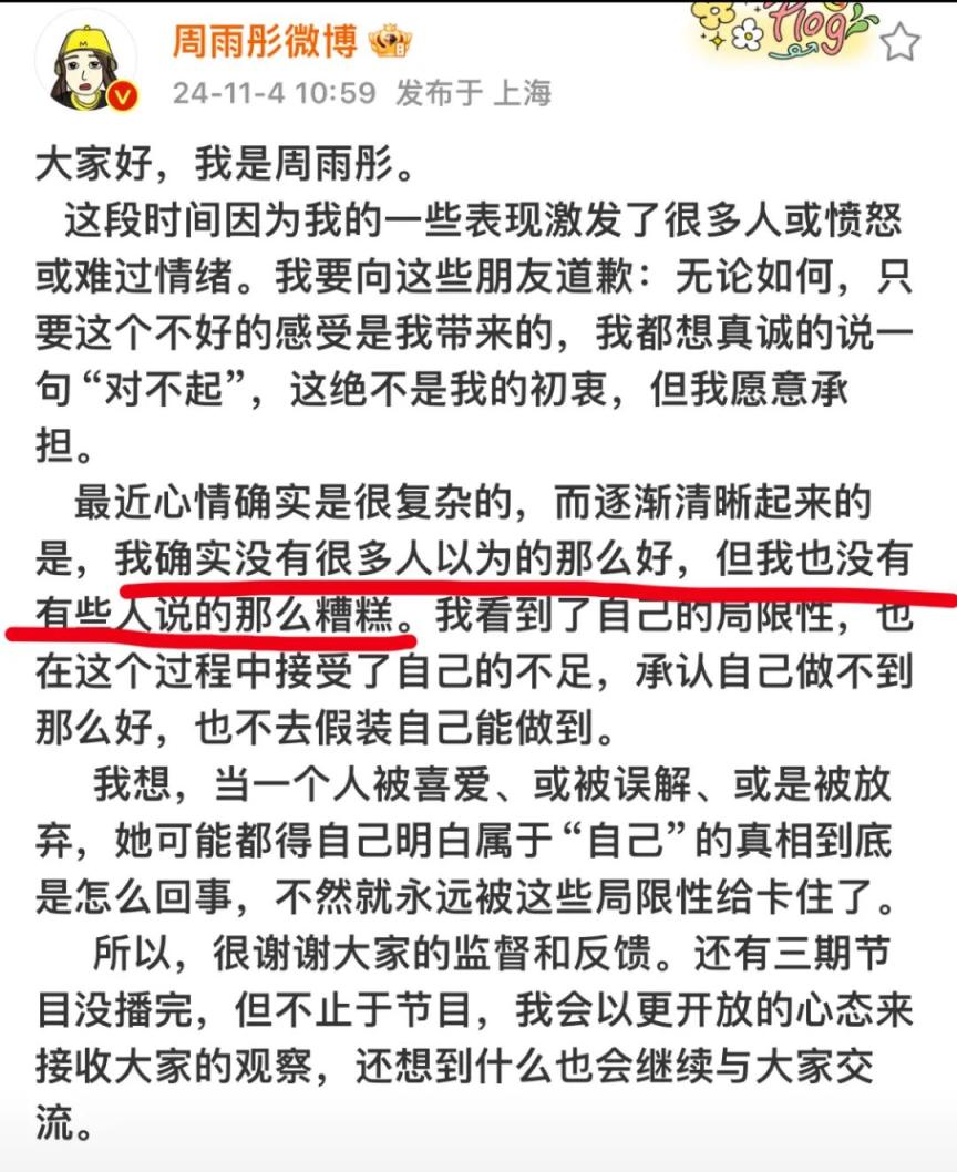 看得出,周雨彤其实并不理解为什么会激起如此强烈的舆论情绪,她选择道歉,仅仅因为作为公众人物的自觉——将有争议的行为视作一种个人局限性,并愿意以开放的心态接受反馈。