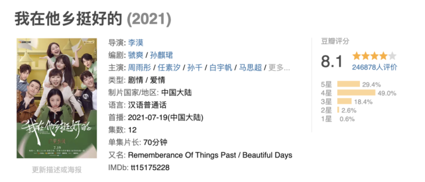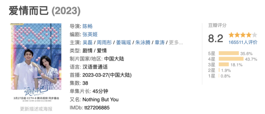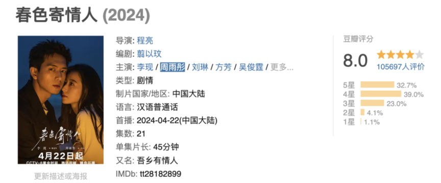 凭借《我在他乡挺好的》《爱情而已》《春色寄情人》三部豆瓣评分超过8分的热播剧,周雨彤的业内口碑和路人缘一向很好,是为数不多的演技派小花。